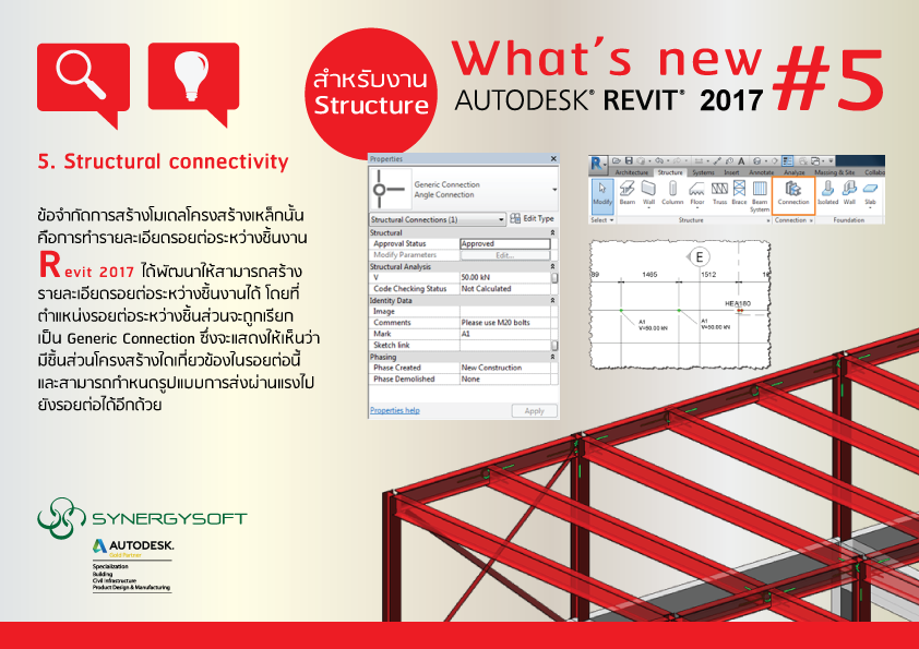 Revit 2017 ได้มีคำสั่ง Connection เพิ่มขึ้นมาเพื่อช่วยในการออกแบบรอยต่อของชิ้นงานโครงสร้าง ในรูปแบบต่างๆตามความต้องการของผู้ออกแบบ ซึ่งจะอ้างอิงตาม Design Code ของทาง สหรัฐอเมริกา และทางยุโรป เป็นหลัก ทั้งนี้ยังสามารถทำการเชื่อมโยงข้อมูลไปยังโปรแกรม Advance Steel เพื่อจัดทำรายละเอียดเพิ่มเติมได้อีกด้วย