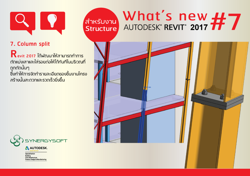 Revit 2017 ได้พัฒนาให้สามารถทำการตัดแบ่งเสาและใส่รอยต่อให้ได้ทันทีในบริเวณที่ถูกตัดนั้นๆ ซึ่งทำให้การจัดทำรายละเอียดของชิ้นงานโครงสร้างนั้นสะดวกและรวดเร็วยิ่งขึ้น