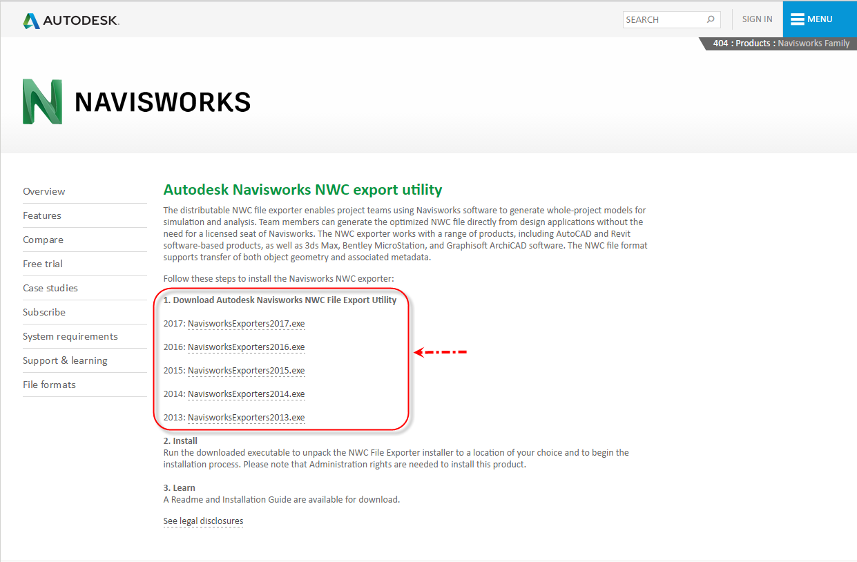 1. ทำการดาวน์โหลด Autodesk Navisworks NWC export utility จาก www.autodesk.com/products/navisworks/autodesk-navisworks-nwc-export-utility โดยเลือก Version ให้ตรงกับที่ใช้อยู่ปัจจุบัน ดังรูป