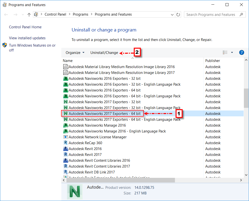 4. หากยังไม่พบคำสั่งดังกล่าว ให้เข้าไปทำการตรวจสอบใน Programs and Features เลือก Navisworks Exporters ตาม Version ที่ลงไว้แล้ว Click Uninstall/Change