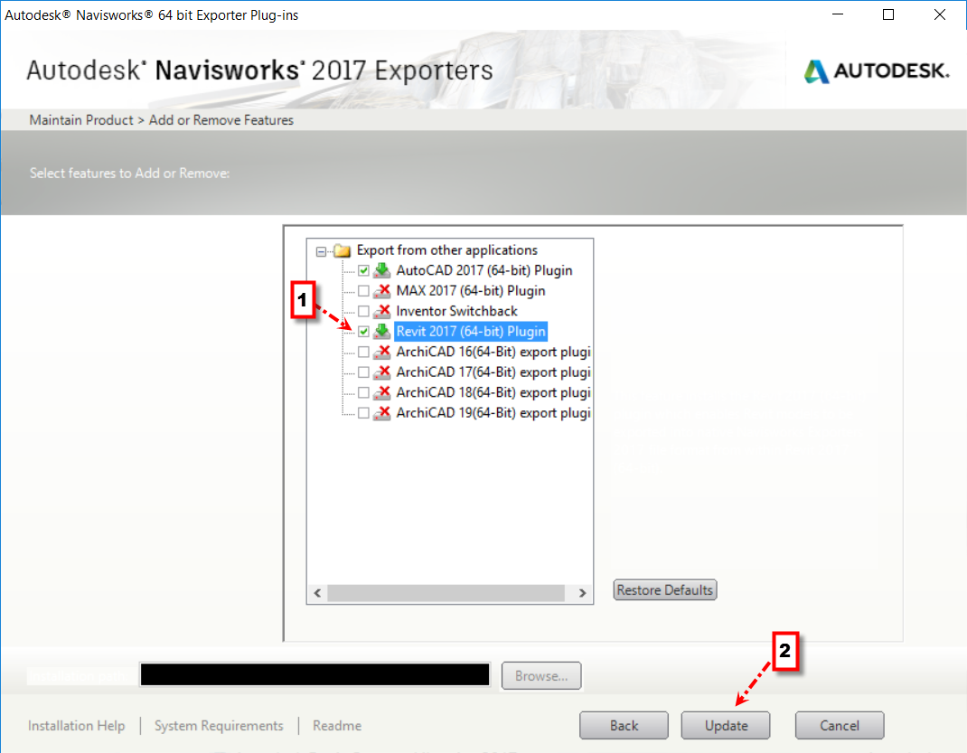 6. ทำการเลือกที่ Revit ให้แสดงเครื่องหมายถูกแล้วกด Update เพื่อให้ Revit แสดงผลคำสั่ง Navisworks Exporters ในส่วนของ External Tools และในปุ่ม Application button มุมซ้ายบน