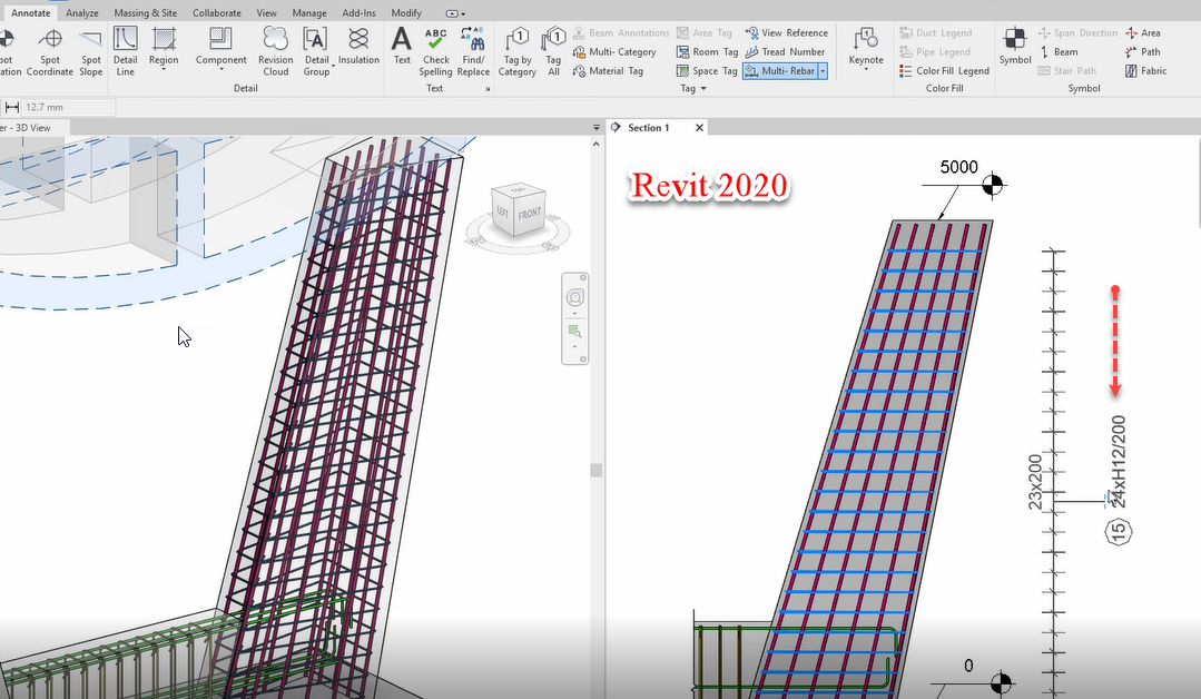 ใน Revit 2020 นั้น สามารถใช้คำสั่ง Multi-Rebar Annotation เพื่อทำการชี้บอกรายละเอียดของเหล็กเสริม ทำให้การจัดทำแบบ Shop Drawing นั้นสะดวกขึ้น ดังรูป