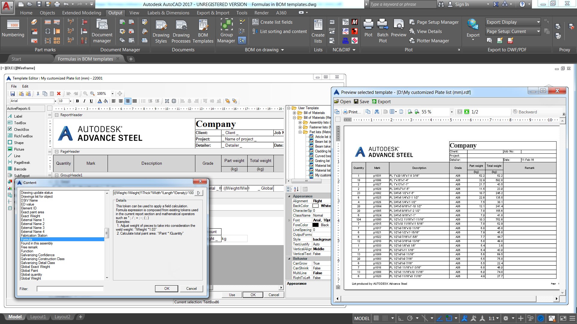 รูปแบบของตารางแสดงปริมาณงานใน Autodesk Advance Steel 2017 ได้ถูกนำมาปรับปรุงใหม่ให้สามารถใส่สูตรเพื่อปรับข้อมูลชิ้นส่วนให้สอดคล้องกับยอดที่สั่งผลิตมาได้ เช่น ต้องการที่จะใส่ปริมาณเพิ่มไปอีก 5% สำหรับการจัดส่งไปยังหน้างานก่อสร้าง ก็สามารถเพิ่มเข้าไปในตารางได้ เป็นต้น