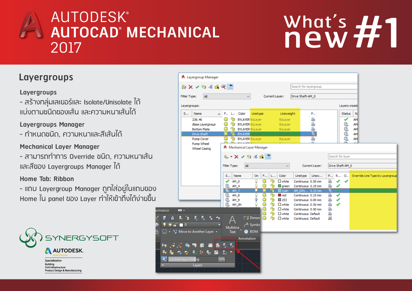 - AutoCAD® Mechanical 2017 เพิ่มเติมคำสั่งในส่วนของการจัดการเลเยอร์ สามารถสร้างกลุ่มของเลเยอร์ได้ พร้อมทั้งสามารถ Isolate/Unisolate กลุ่มของเลเยอร์ได้ สามารถสร้างกลุ่มแบ่งตามชนิดของเส้น และความหนาเส้น ได้