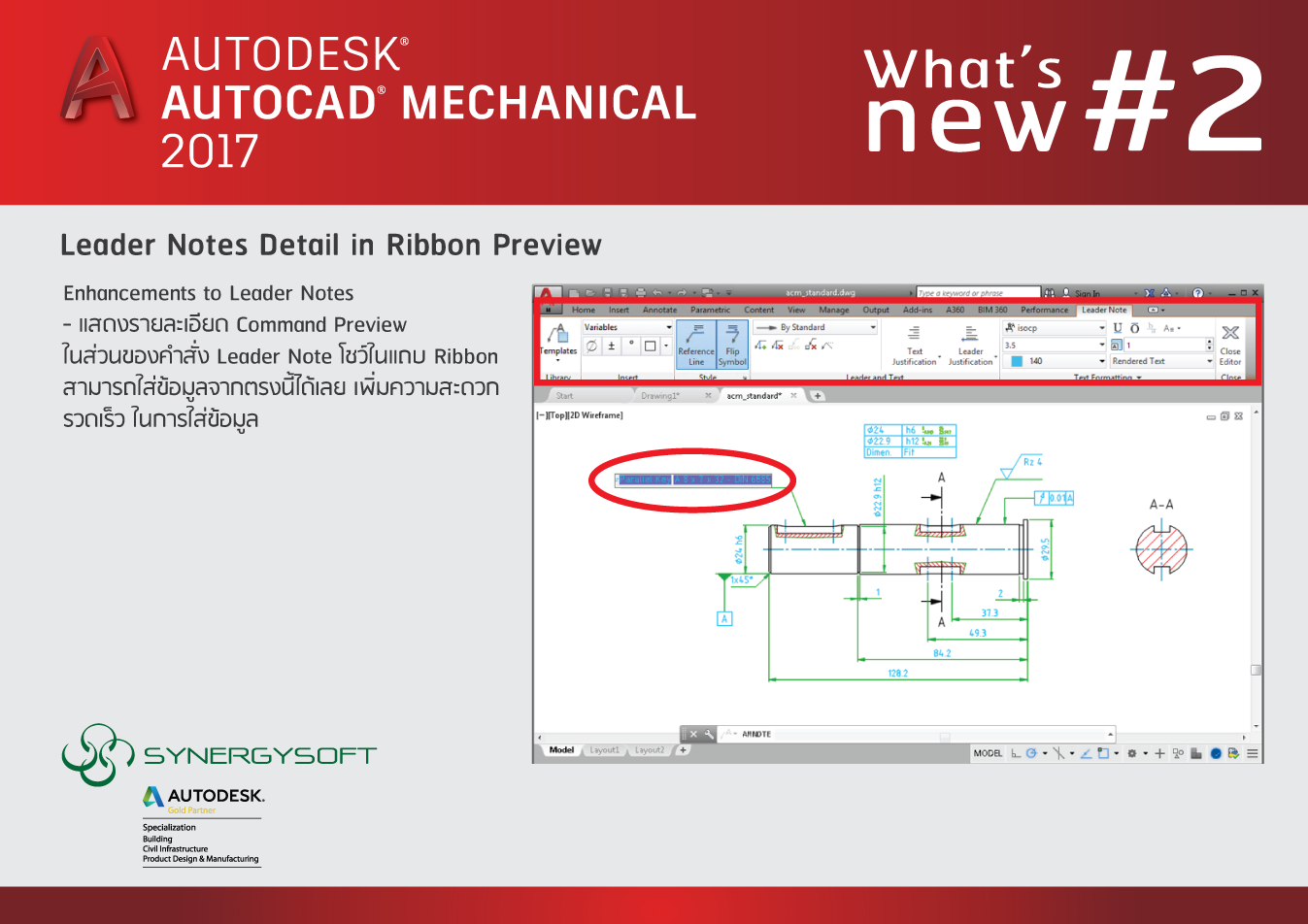 Enhancements to Leader Notes แสดงรายละเอียด Command Preview ในส่วนของคำสั่ง Leader Note โชว์ในแถบ Ribbon สามารถใส่ข้อมูลจากตรงนี้ได้เลย เพิ่มความสะดวก รวดเร็ว ในการใส่ข้อมูล
