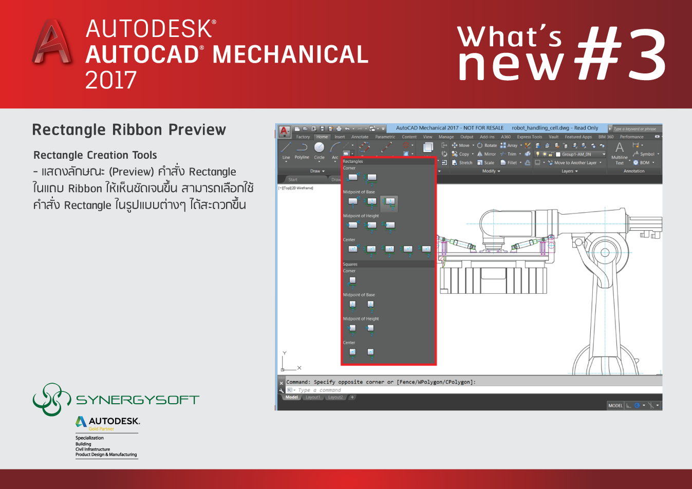 เพิ่มเติมการแสดงลักษณะ (Preview) ในส่วนของคำสั่ง Rectangle ในแถบของ Ribbon ให้เห็นชัดเจนขึ้น สามารถเลือกใช้ คำสั่ง Rectangle ในรูปแบบต่างๆ ได้สะดวกขึ้น