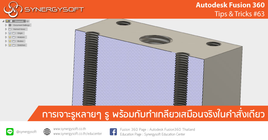 โปรแกรม Fusion 360 ผู้ใช้งานสามารถสร้างรูและเกลียวได้อย่างรวดเร็วและง่ายดายมากยิ่งขึ้น โดยเฉพาะอย่างยิ่งการใช้คำสั่งในการเจาะรูหลายๆ รูพร้อมกับสร้างเกลียวเสมือนจริงในคำสั่งเดียว ซึ่งจะช่วยประหยัดเวลาและเพิ่มประสิทธิภาพในการทำงานได้เป็นอย่างมาก